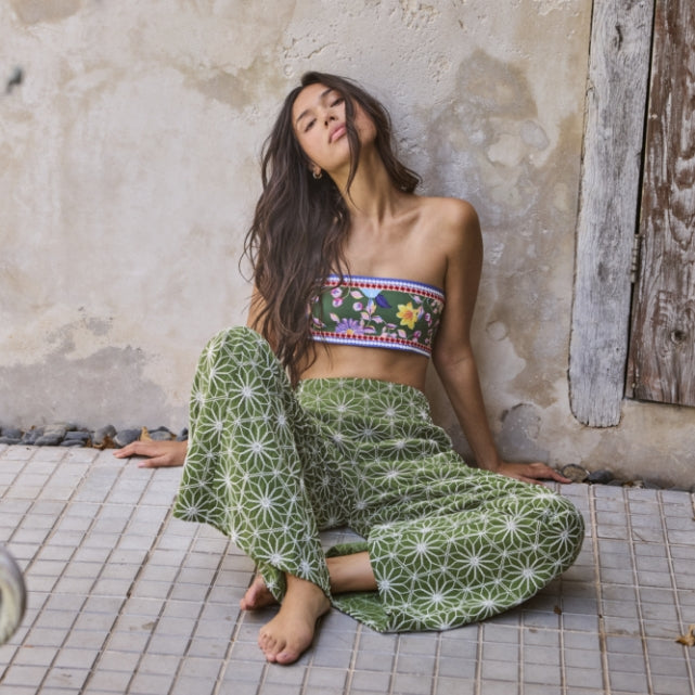 Inspired by the timeless beauty of flowers and the delicate elegance of illustrated vases, this collection represents a showcase where prints with radiant tones, oily textures, geometric trims, and intricate freehand details are displayed, transforming them into pieces of art that immortalize and perpetuate the brand's romantic history.